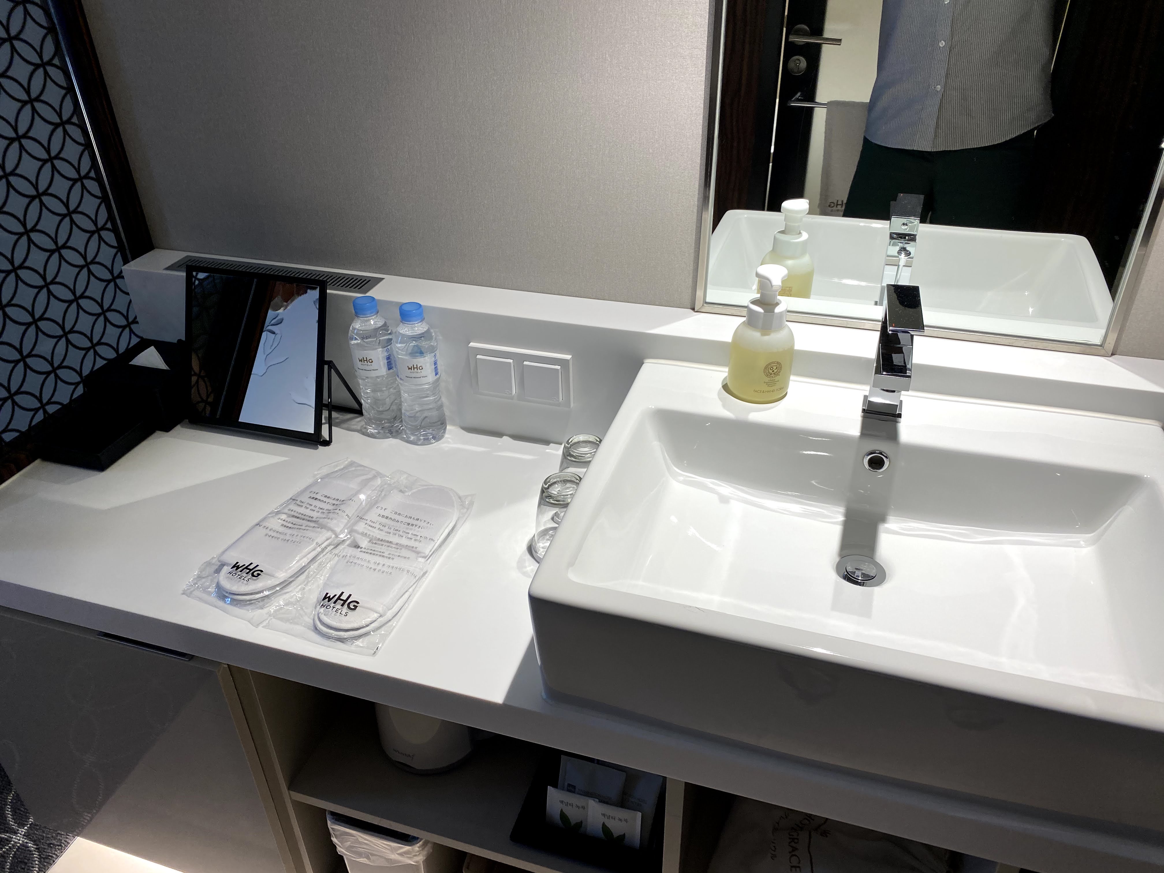 세면대 공간. 세면대 아래에는 커피포트와 차종류, 그리고 청결용품이 구비되어 있다. 일회용 칫솔도 구비되어 있고, 입욕제까지 두 개나 들어있어 입욕제도 유용하게 사용했다. 목욕을 두번이나!